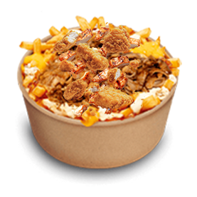 2 Viandes au choix + Sauce fromagère + Sauce cheddar + Frites.