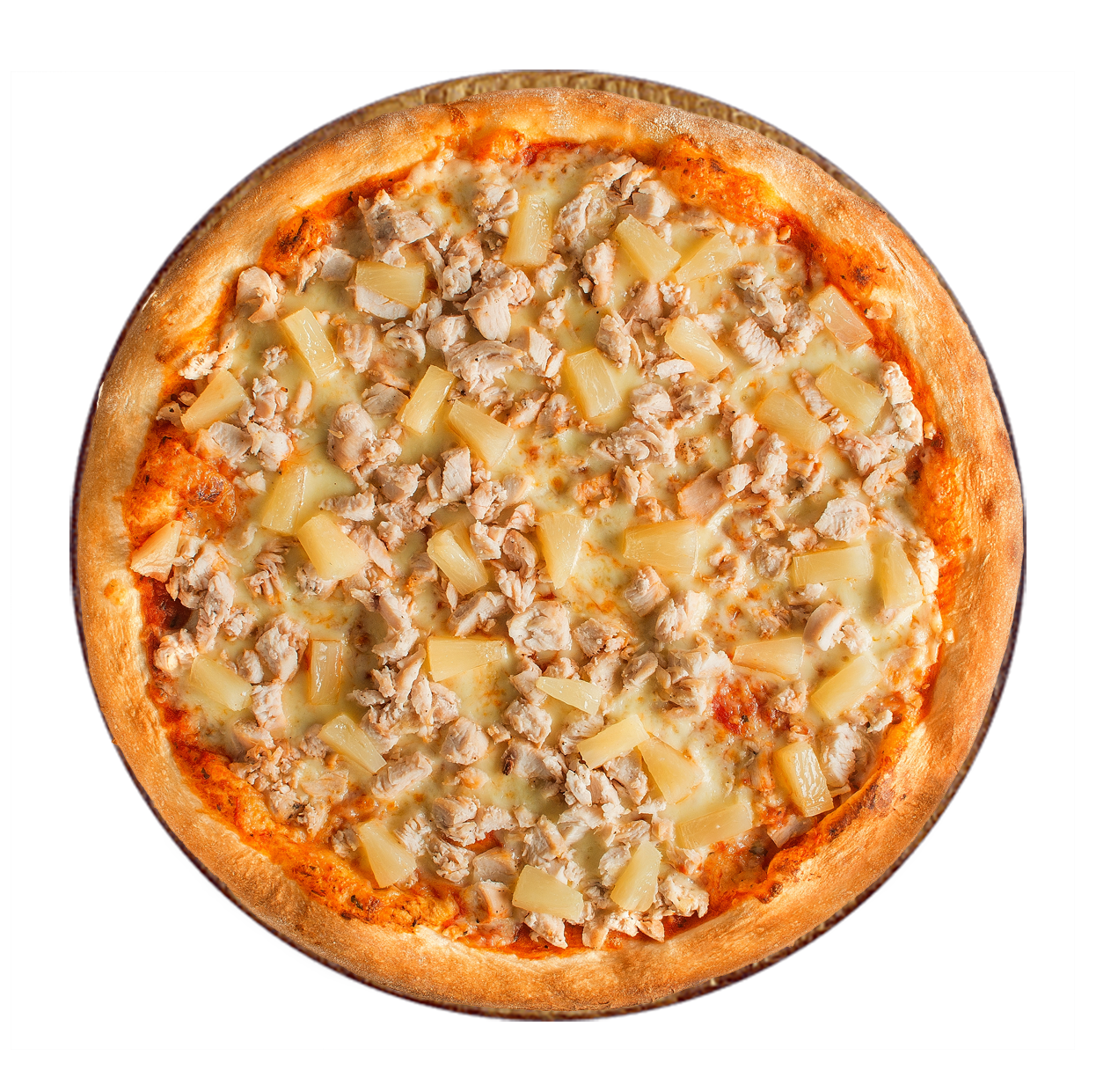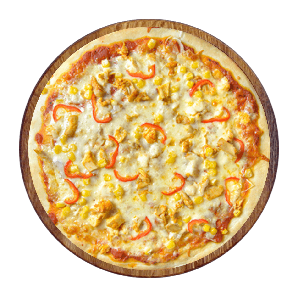 Sauce curry, mozzarella, poulet, poivrons, oignons.