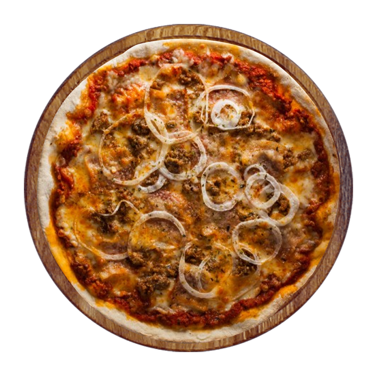 Sauce barbecue, mozzarella, bœuf haché, oignons, poivrons, origan.