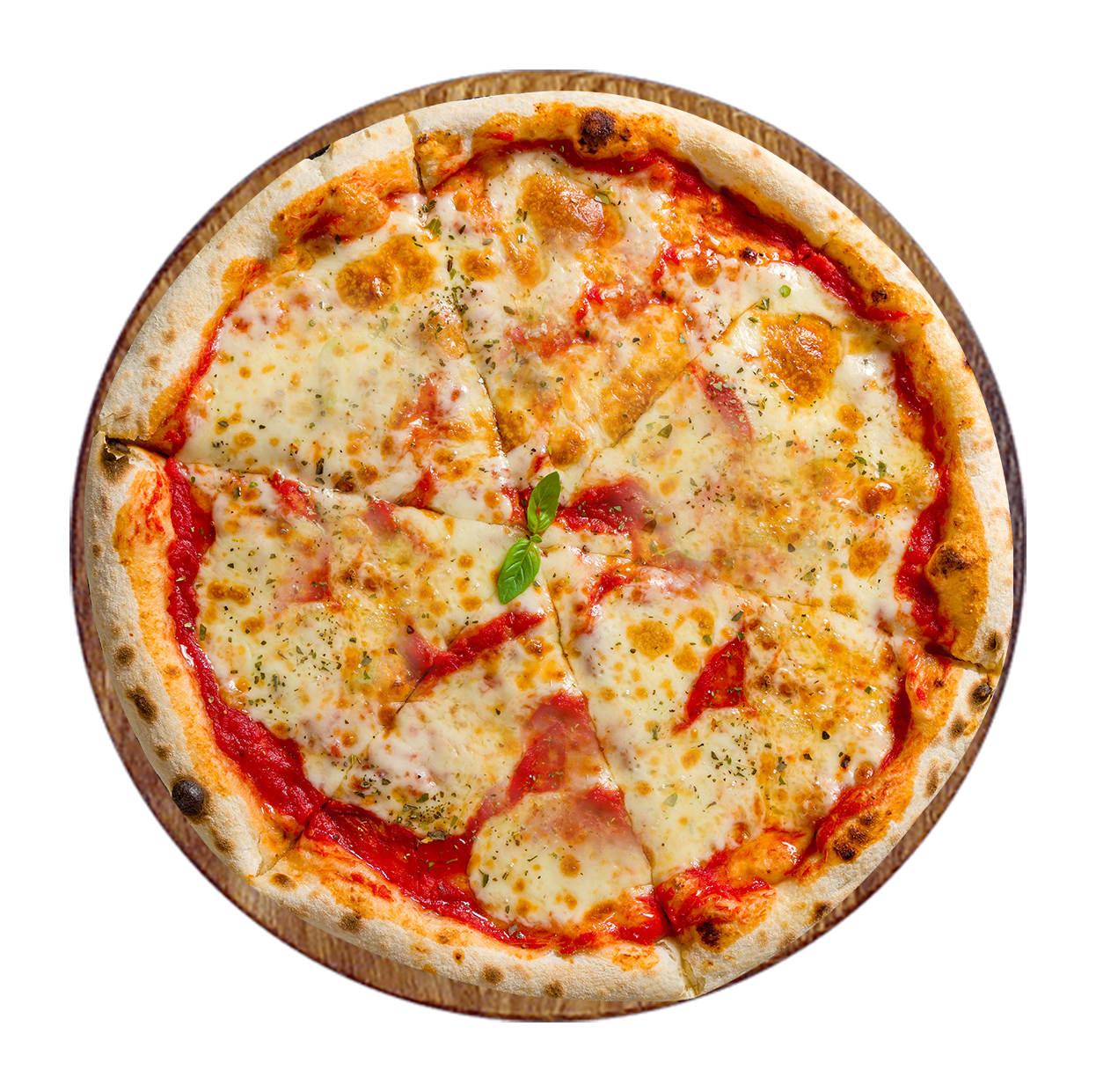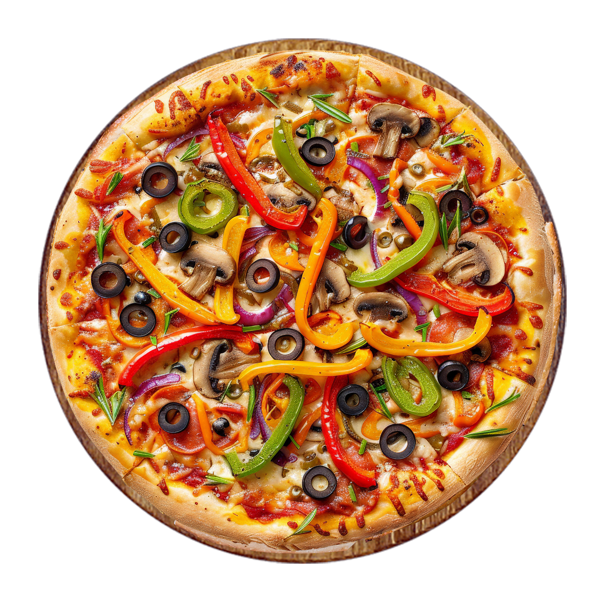 Tomate, mozzarella, champignons, oignons, artichauts, poivrons, olives, aubergines.