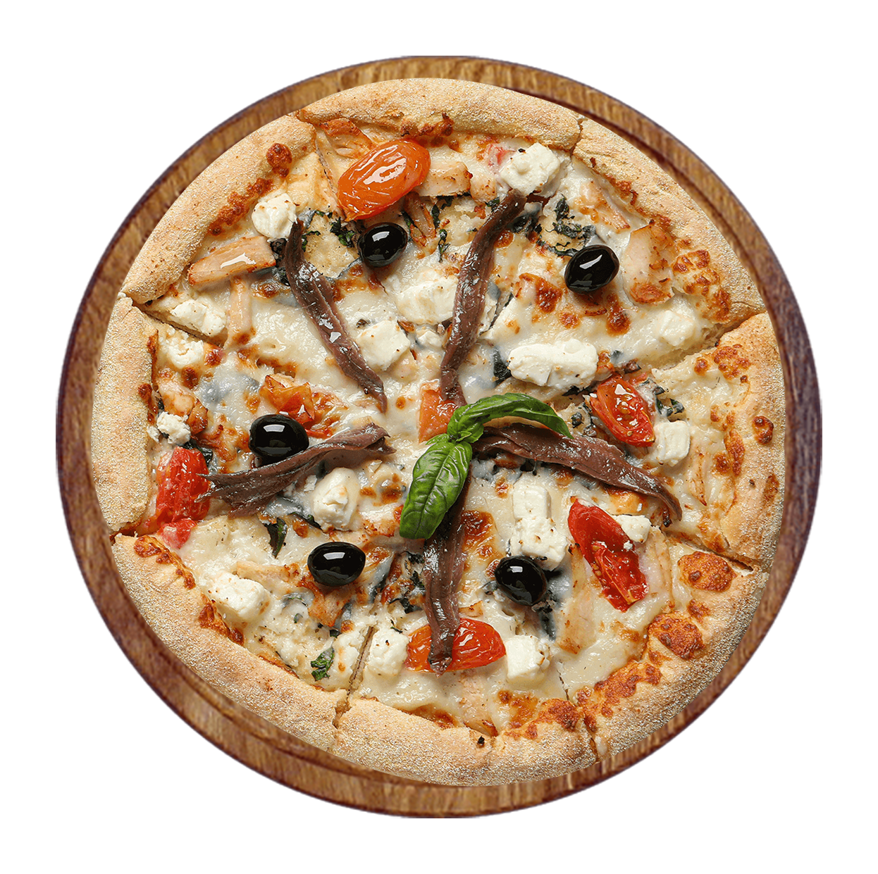 Tomate, mozzarella, anchois, câpres, olives.