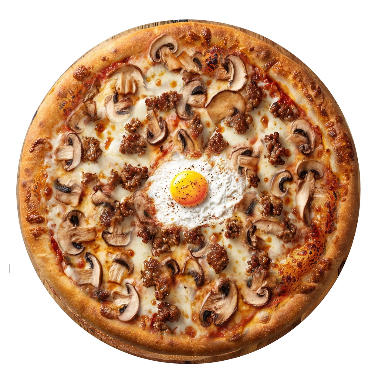 Tomate, mozzarella, bœuf haché, champignons, œuf.