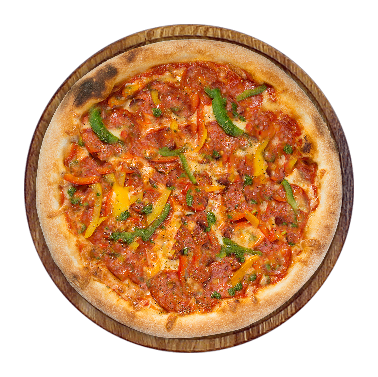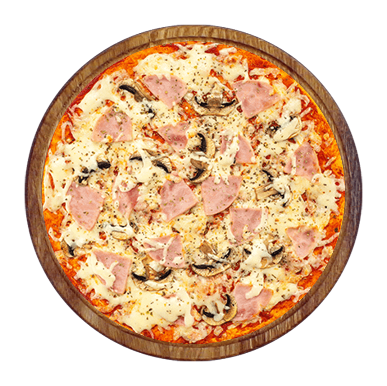 Tomate, mozzarella, jambon, poivrons, oignons, chèvre, ail, persil.