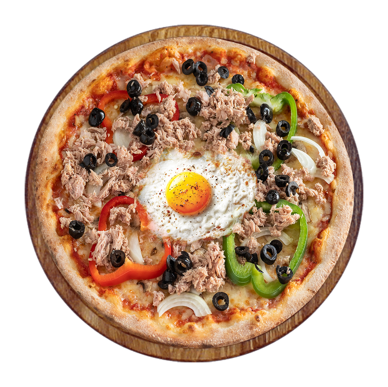 Tomate, mozzarella, thon, poivrons, oignons, olives, œuf.