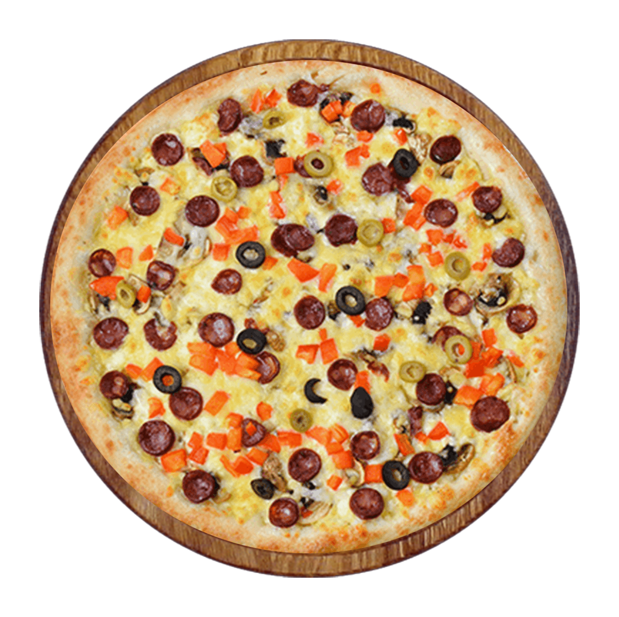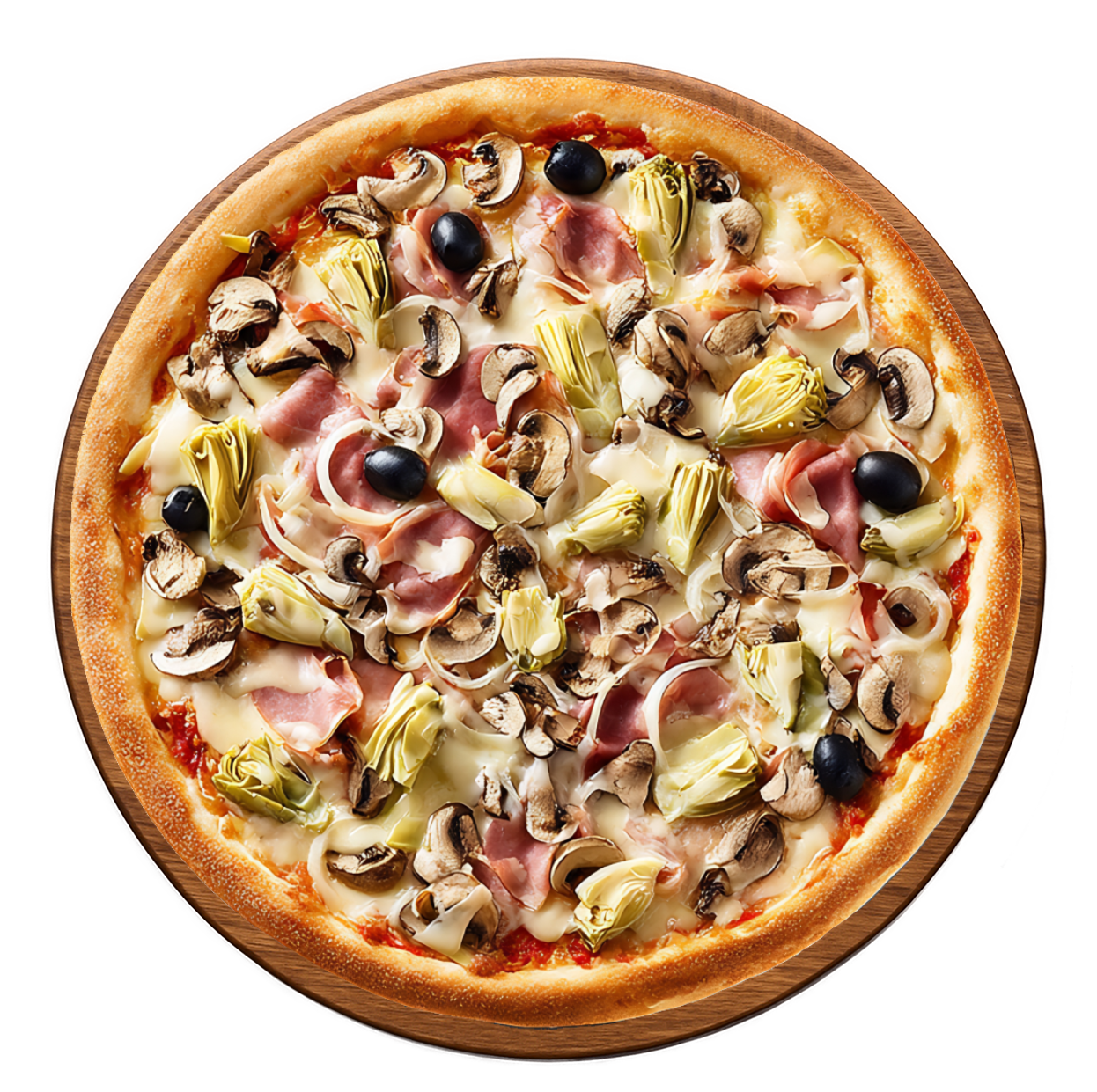 Tomate, mozzarella, jambon, champignons, artichauts, poivrons, olives.