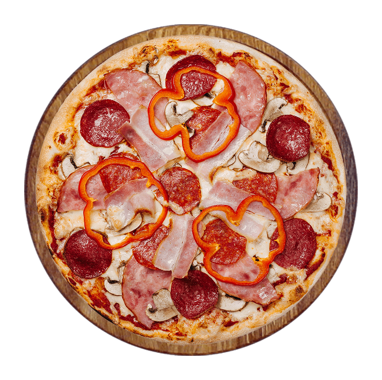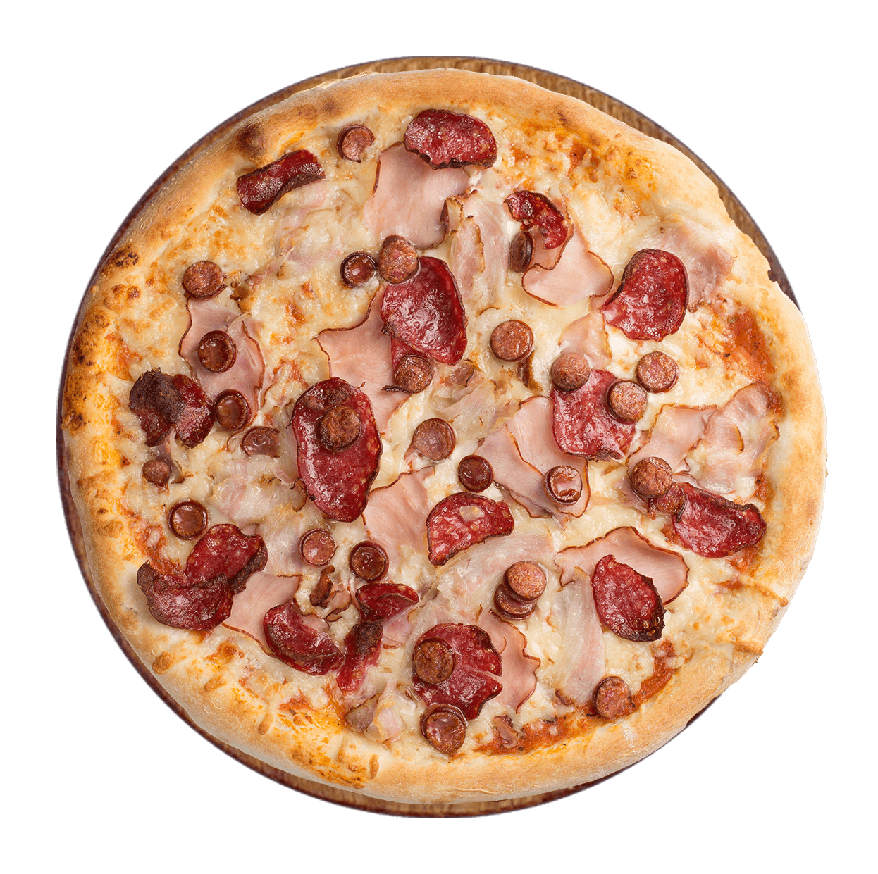 Tomate, mozzarella, jambon, lardons, chorizo.