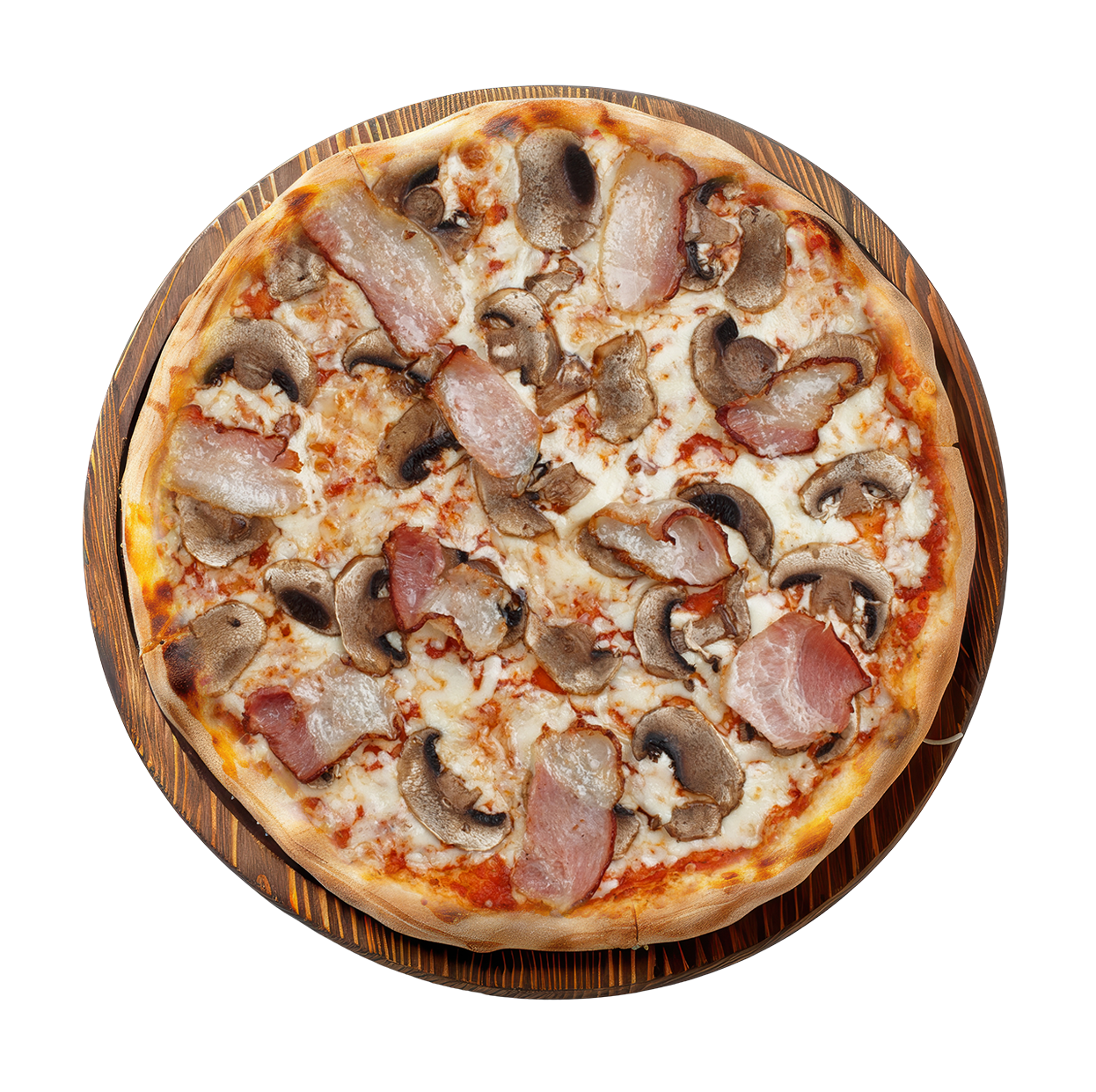 Tomate, mozzarella, bœuf haché, bacon, chèvre, champignons.