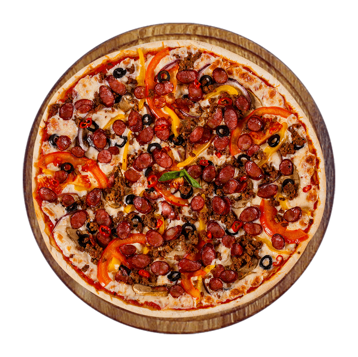 Tomate, mozzarella, bœuf haché, chorizo, poivrons, tomates fraiches, œuf, olives.