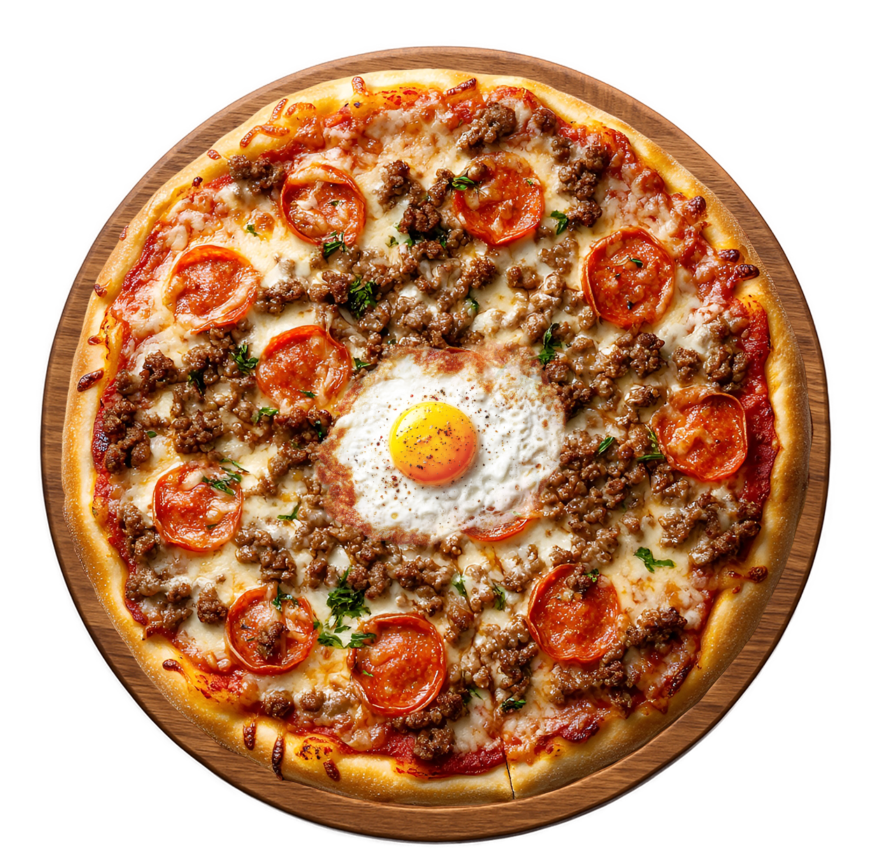 Tomate, mozzarella, jambon, merguez, chorizo, œuf.